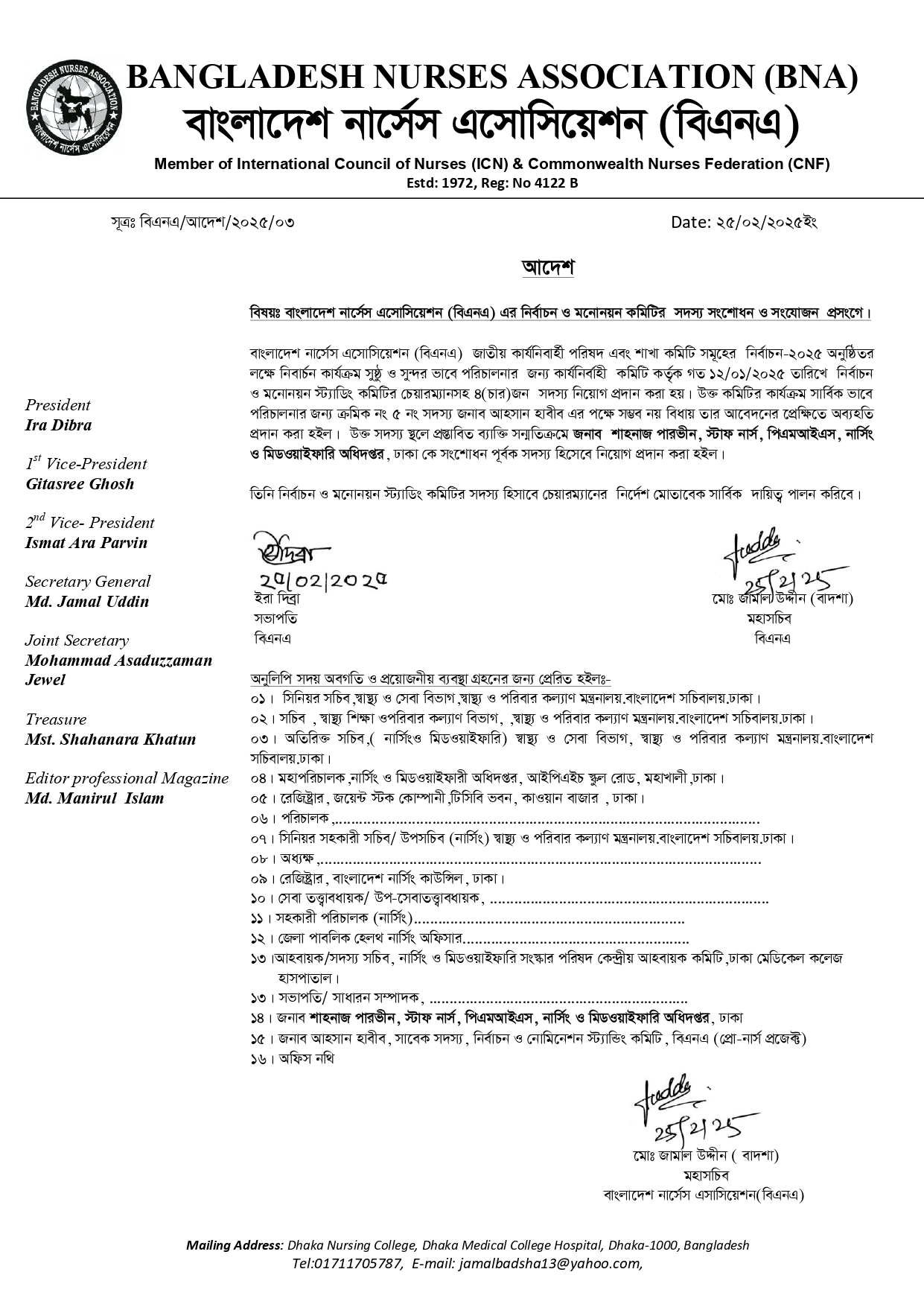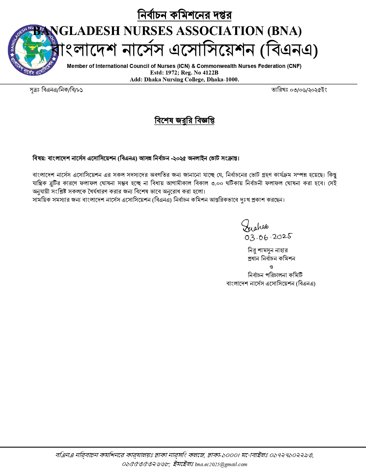 নির্বাচন কমিশন কর্তৃক জেলা ভিত্তিক বিএনএ শাখা চেয়ে আবেদন আহবান